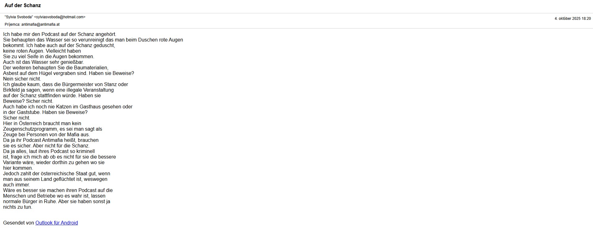 Nie sme tu preto, aby sme vytvárali negatívne emócie, ale za súčasný stav v štáte nemôžu ani cudzinci, ani azylanti, ani ufóni, len ľudia z Rakúska. Už vyše roka bývame v Štajersku, a to konkrétne na mieste Auf der Schanz, vo výške 1200 m nad morom. Prišli sme sem hľadať pokoj, ale ako to v živote býva, odhalili sme skrytý nacizmus v ľuďoch, nenávisť a prenasledovanie len preto, že nemáme v rodnom liste napísané miesto narodenia Rakúsko. Začnime od konca: Dňa 04.10.2025 sme na nás oficiálny email antimafia@antimafia.at obdržali tento email.