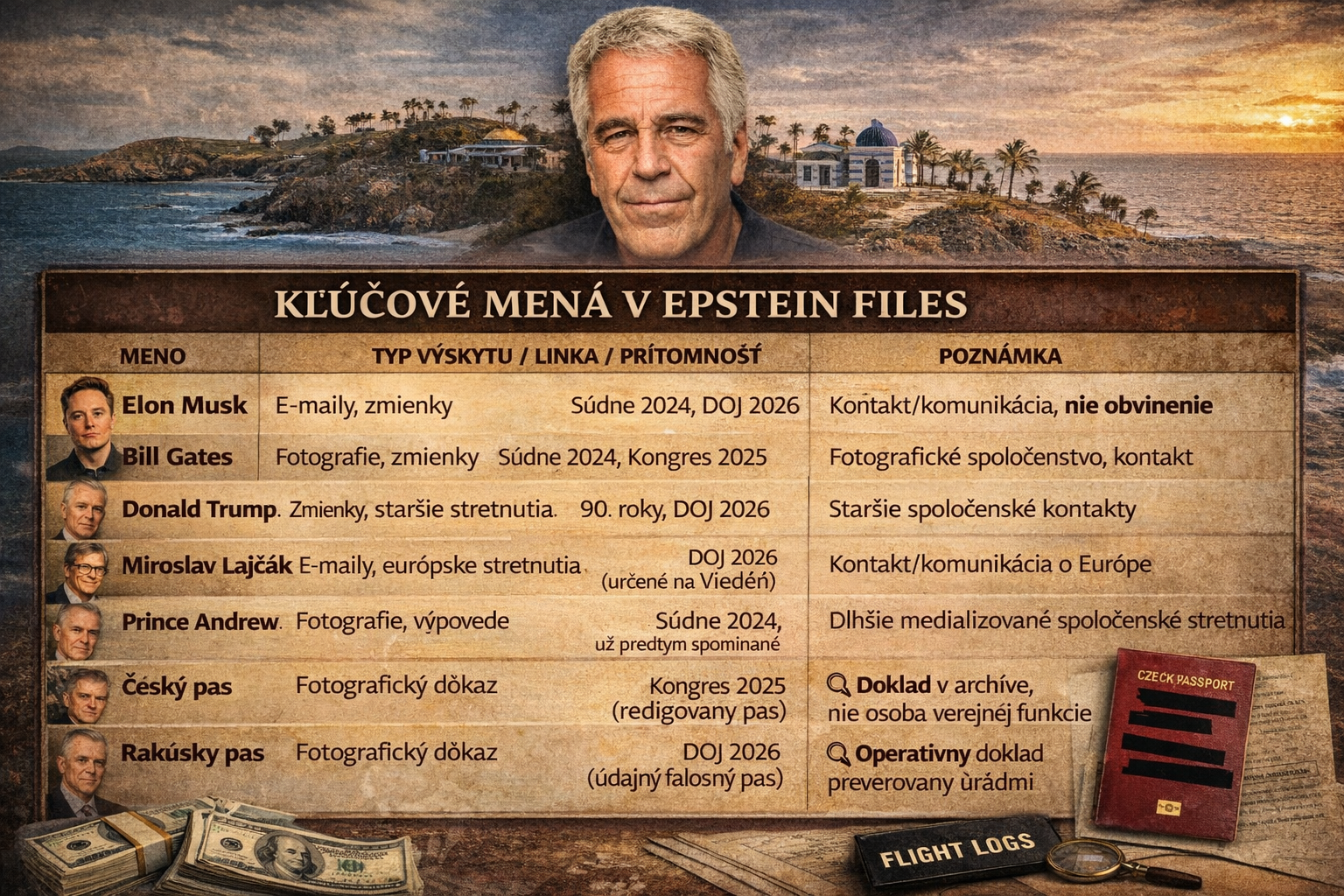 Najnovší balík (2026) pridáva masívny objem materiálu a zvyšuje viditeľnosť kontaktov s elitami (biznis, politika, šoubiznis) – preto sa opäť rozbehli mená ako Musk/Gates/Trump v médiách.